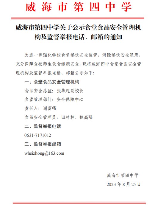 kkpay00关于公示食堂食品安全管理机构及监督举报电话、邮箱的通知