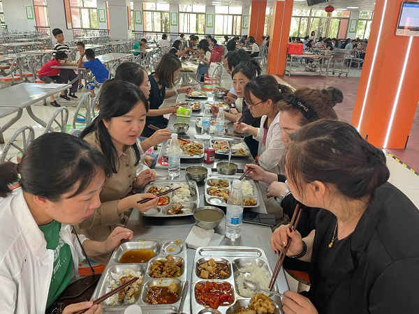 午餐时间,学校领导陪同家长至食堂查看就餐环境是否清洁卫生,查看学生饭菜的种类、外观,介绍食堂管理及饭菜质量的基本情况,并和学生一起共进午餐,品尝饭菜,监督检查饭菜质量、口味与饭菜数量。