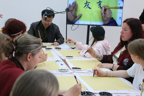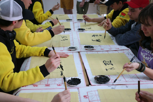 俄罗斯青少年队员们参观了kkpay00的书法教室,在书法老师的指导下,学习握笔、运笔、行笔,尝试书写“友谊”二字。笔尖跳跃于宣纸,墨香四溢。队员们全神贯注,通过一笔一画的纵横交错,感受着中国文化的博大精深。王玉洁校长为来访客人赠送了书法作品,以此表达对这份来自远方友谊的珍视。