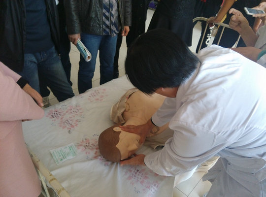 突发事件中,急救车到达的时间一般为10-20分钟,而一般认为人体心跳停止的4分钟内必须进行抢救,否则超过这一时限神经系统将会遭受比较严重的损害。为帮助全校师生掌握心肺复苏这一挽救心跳呼吸停止患者生命最重要的急救技术, 11月2日—4日,学生处组织了三期心肺复苏培训。下午3点15分,高一、 高二、高三级部班主任分批在6楼医务室进行心肺复苏培训,指导医生是文登中心医院的刘医生和校医杨英。