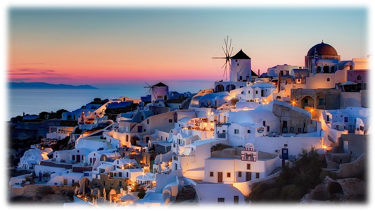 圣托里尼美得无与伦比,丰富地展现她的多姿多彩的地形和村落。村落的建筑是很典型的基克拉泽斯的特色,白色的墙壁搭配深蓝色的圆屋顶。蓝色在天空和海水之间重申着温暖的主题,而白色在三种蓝色和阳光的调和下,为这幅水彩画增添了明亮的基调。一切的都是清新的,温馨的,仿佛在等待什么人来享受她到心的最深处去。