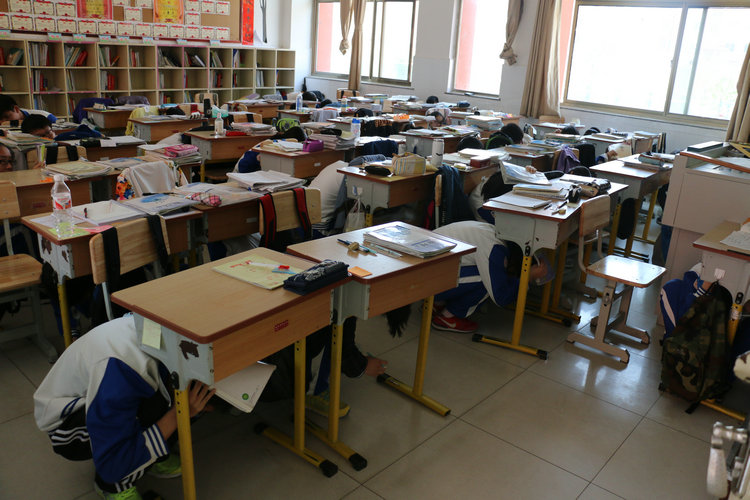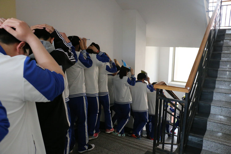 每次地震逃生演练前,学生发展研究中心召开关于地震应急逃生演练的班主任会,专门部署演练工作。为了进一步明确疏散集合地点、疏散顺序和注意事项,学生发展研究中心下发给每位班主任和军体委员《逃生演练方案》,并在会后由班主任和军体委员将如何根据所处环境迅速作出保障安全的选择传达给班级每一位学生。第一次警报响起,第一时间躲在牢固的课桌下,身体蜷曲降低重心,抓住牢固物体,远离窗户。第二次警报响起,教学楼一、二层和实验楼的学生听到班主任老师的撤离信号,单排队形跑向最近的安全出口,沿楼梯墙边迅速撤离,避免踩伤、摔伤。第三次警报后,教学楼三、四层的学生迅速撤离。第四次警报后,剩余楼层的学生全部迅速、有序安全地到达操场空地,并原地蹲下,双手保护头部。各班班主任清点本班人数跑步向年级主任汇报,年级主任汇总后跑步向应急逃生总指挥王建光校长汇报。