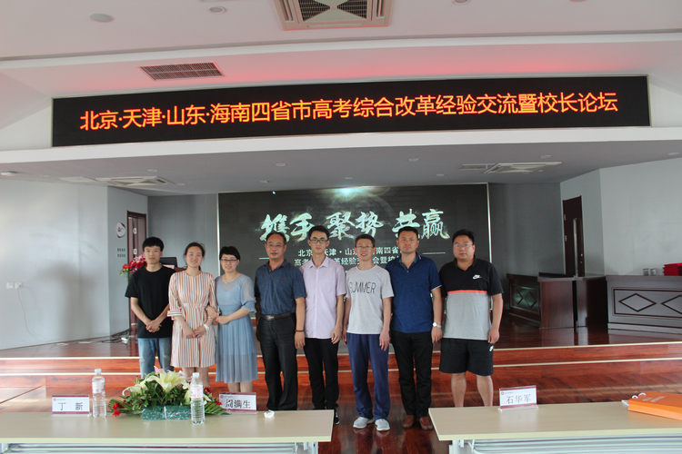 为了对新高考综合改革有深刻理解,把握新高考政策,深度开展课程改革,学习课程体系建构、选课走班实施策略等优秀案例,优化我校选课走班实施策略、整合我校教育资源,为幸福学子提供高品质教育服务,达成幸福教育办学目标。于6月30日至7月1日,由邓思源副校长带队,带领张立正主任、周国栋等8人学习团队赴青岛参加“北京·天津·山东·海南四省市高考综合改革经验交流会暨校长论坛”。