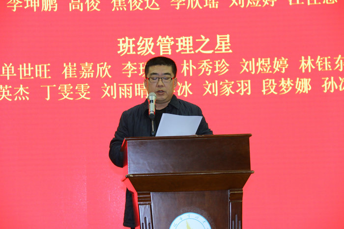 王伦胜副主任从同学升入高二的点滴说起,回忆感动瞬间,分享对同学们成长的喜悦,随后他依次宣读了优异之星、学科状元、进步之星、管理之星、自律之星、卫生标兵及纪律、卫生先进班级。在激昂的旋律和热烈的掌声中,获奖同学依次走上主席台领取证书并与校长和班主任合影留念。