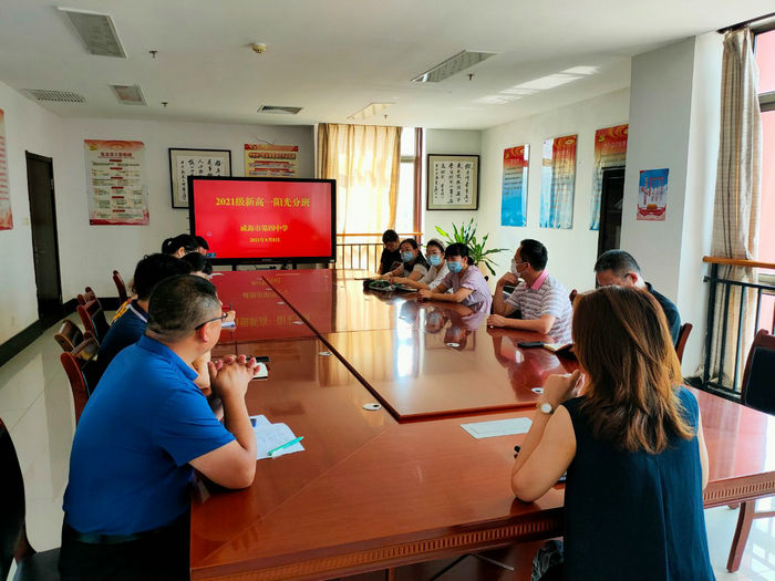8月8日上午,kkpay00召开“2021级新高一阳光分班"会议, 王玉洁校长、刘强副校长、教研中心副主任唐延文、高一级部主任于海生、2021级高一全体班主任参加会议。