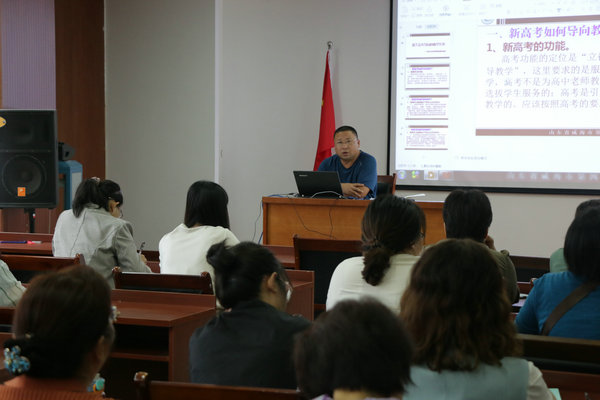 刘强副校长做了《基于高考导向的教学变革》的主题报告,从新高考“立德树人、服务选材、导向教学”的功能切入,他指出,当前的教学应在做好基础知识、基本方法和规范答题方面下功夫,结合不同学科实际,找到可操作性的切入点。在基础年级推行系列化、规范化作业本实施办法,进而规范学生答题。结合市直培训精神,立足我校学情,对于期末统考进行相应反思。在新学期借助白板努力改变课堂组织形式,扎实集体备课和个人有效备课相结合,坚持做实一项提升课堂效率的小抓手推进课堂教学改革。