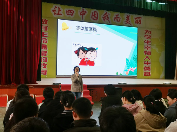 讲座开始前宁老师带领同学们进行了“集体按摩操”的解压互动游戏,同学们相互之间进行助考按摩并伴随着积极有趣的口令,现场氛围异常活跃。随后宁老师通过结合具体事例,对高三学生生活和学习的过程中的常见心理现象进行分析并介绍相对应的心理调节方法和技巧。例如:高原现象、舌尖现象、失眠焦虑等。宁老师结合学生实际情况,对学生最困惑的焦虑情绪,表现的症状、产生的原因及其正面价值进行针对性的分析讲解,并结合生活实际给学生们提供四种过度焦虑的应对方法:认知调整法、情绪整理法和心理暗示法。讲座中,宁老师更具体提出了一些整理情绪的心理操,包括鸣天鼓、提腿摸膝、渐进式肌肉放松、手指曼波等,并带动同学们现场实践。